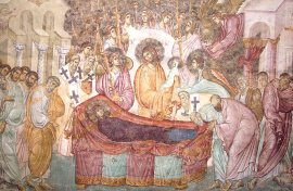 | [11] Царь, войдя посмотреть возлежащих, увидел там человека, одетого не в брачную одежду, [12] и говорит ему: друг! как ты вошел сюда не в брачной одежде? Он же молчал. [13] Тогда сказал царь слугам: связав ему руки и ноги, возьмите его и бросьте во тьму внешнюю; там будет плач и скрежет зубов; [14] ибо много званых, а мало избранных. |