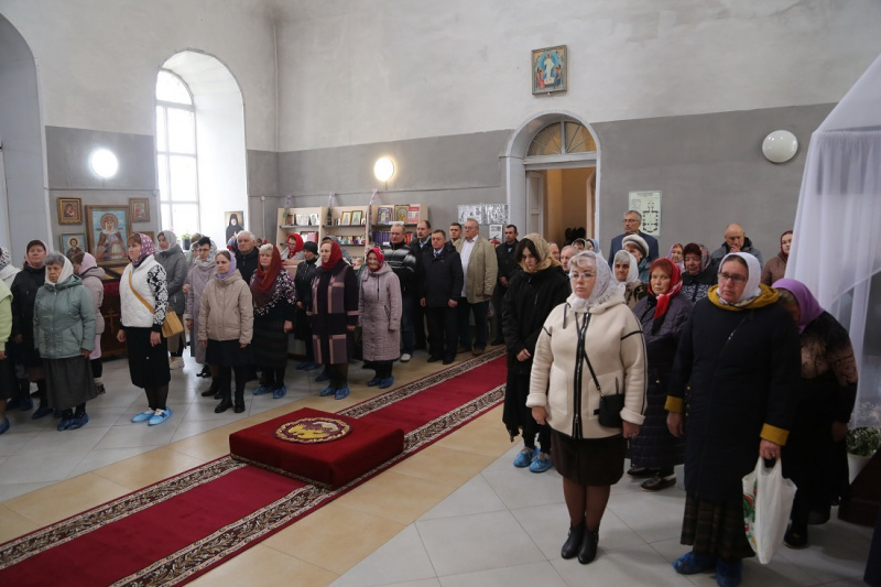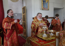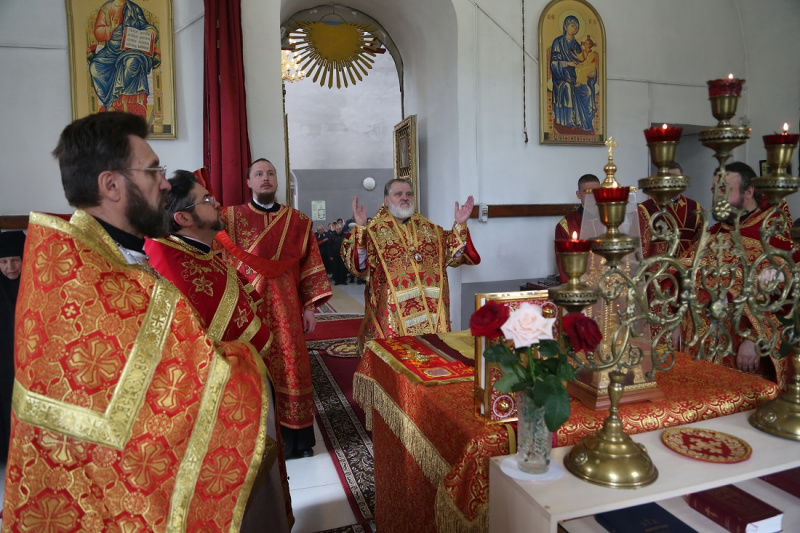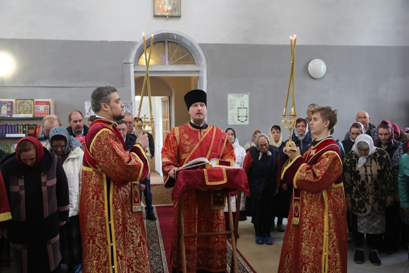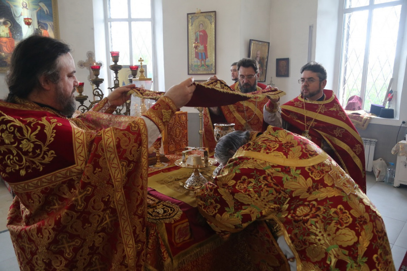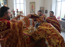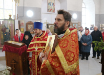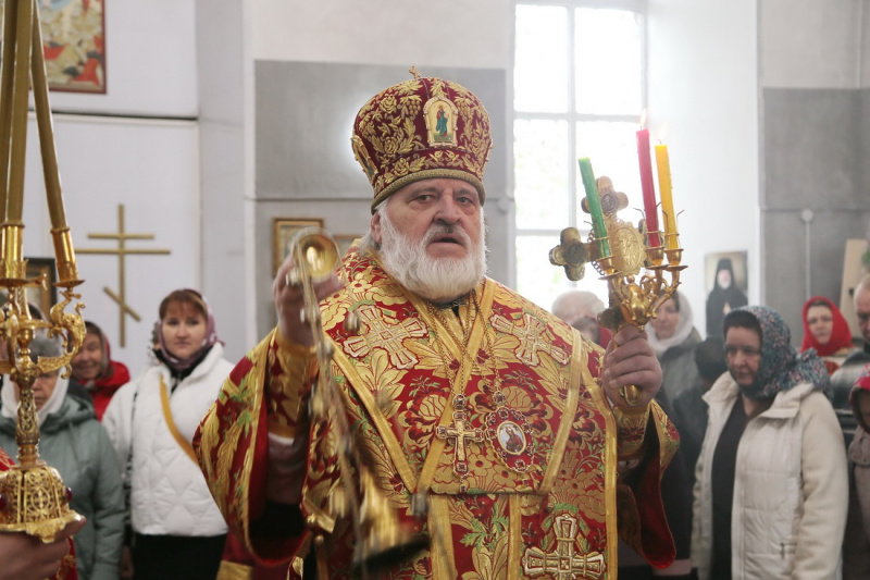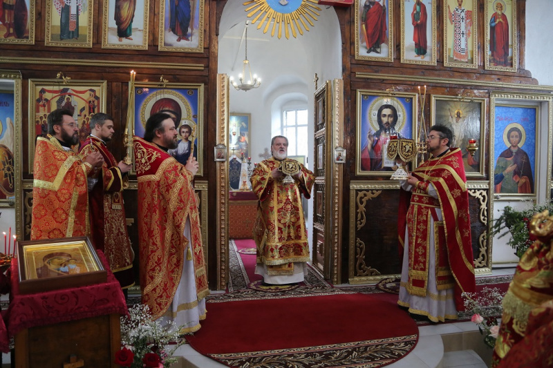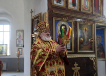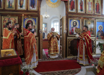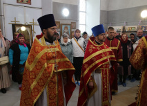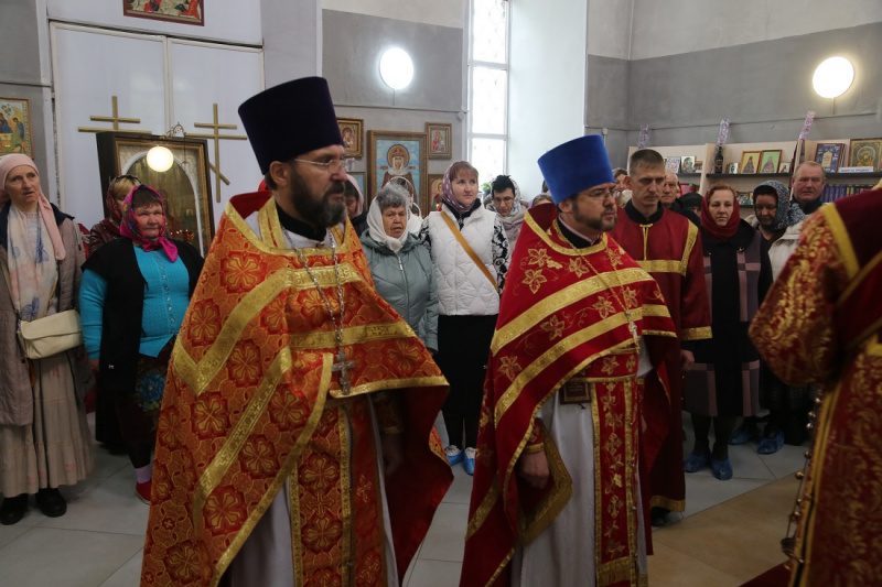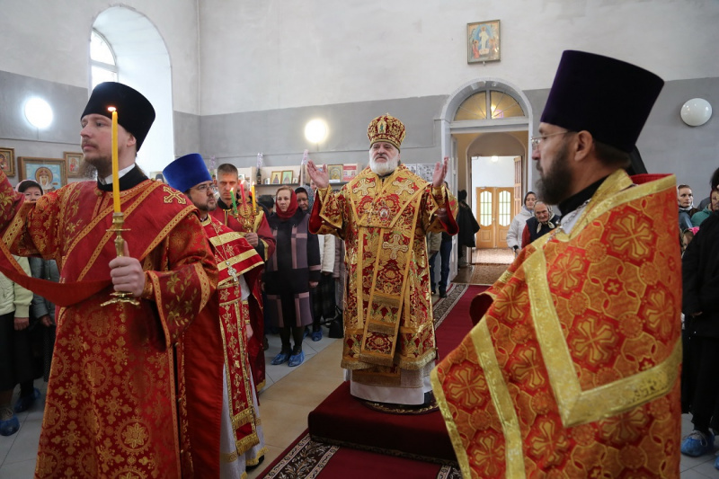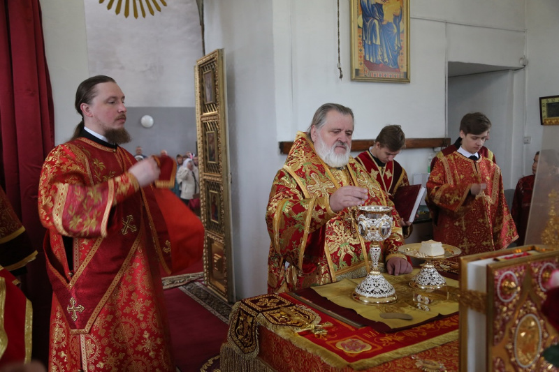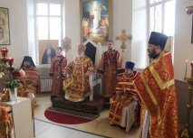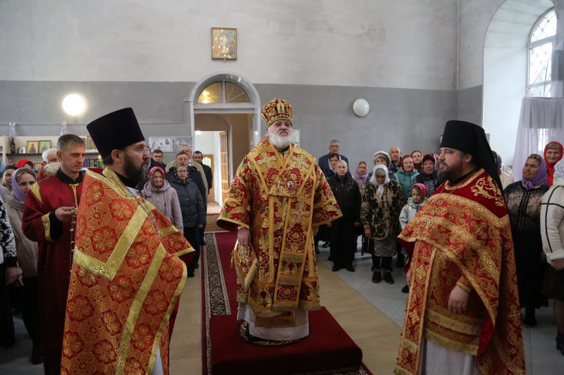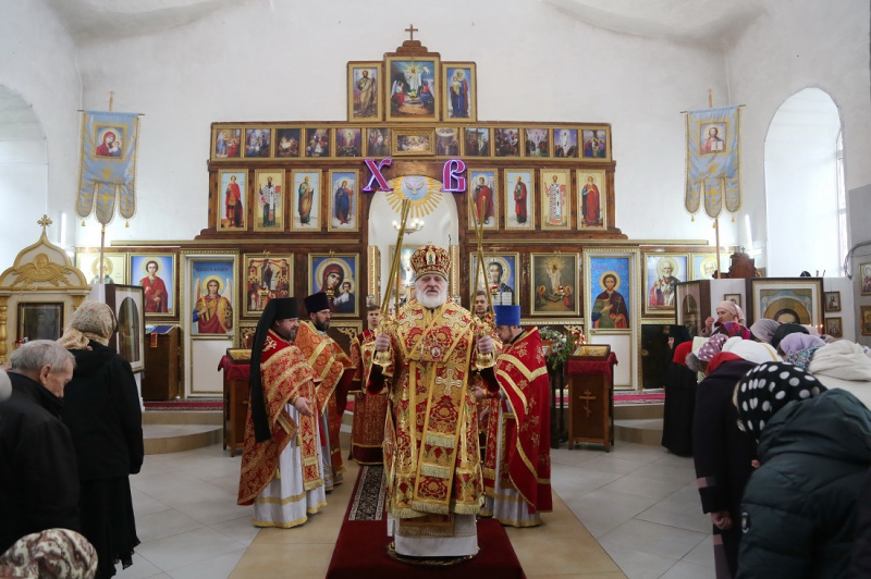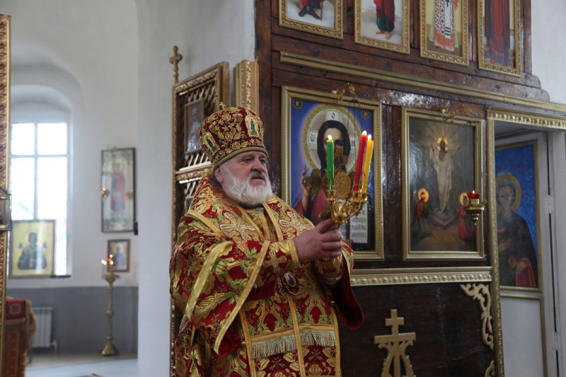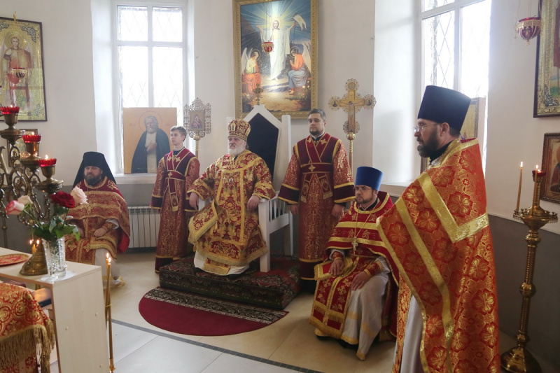 Его Преосвященству сослужили: благочинный округа протоиерей Сергий Афонюшкин, настоятель храма иерей Сергий Чикин, игумен Анастасий (Евстифеев), иеродиакон Анатолий (Волков).