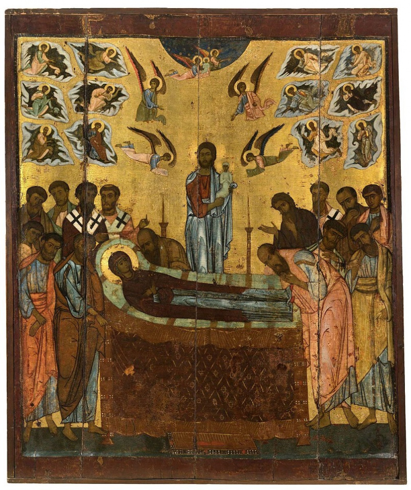 — Эти скорбь и печаль светлы, в них нет безысходности, потому что в событии Успения есть непреложное упование на жизнь вечную. Конечно, апостолы, и все кто знал Божию Матерь, не могли не испытывать чисто человеческих чувств от расставания с Ней здесь, на земле. Но они знают, что Христос Воскрес. И в целом эту мысль передает весь характер иконописного повествования: присутствие Спасителя, держащего душу Богородицы, ангелы, возносящие ее на небо. Ведь по Преданию, Богородица была взята на небеса с душой и телом. Поэтому в колорите иконы Успения мы никогда не увидим ничего мрачного. При всей скорбности события в ней звучат ликующие ноты вечного упования.