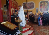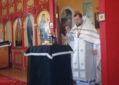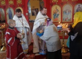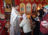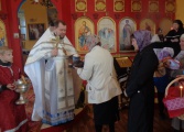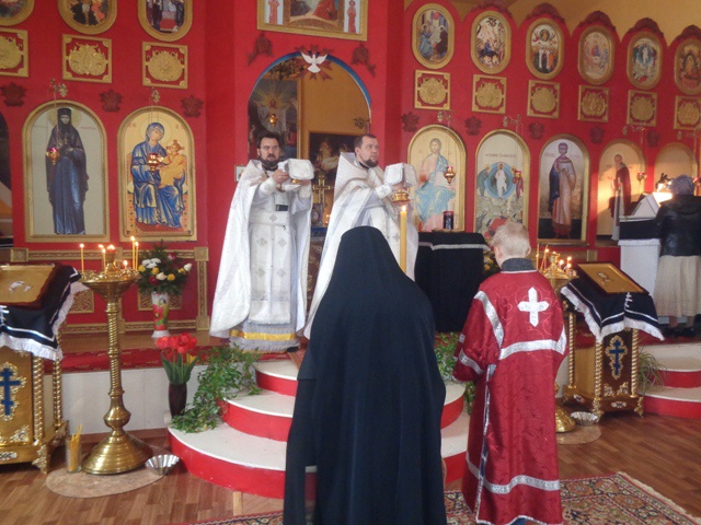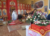 Богослужение возглавил иеромонах Иоанн (Костин). Сослужили иерей Сергий (Чикин) и иерей Александр (Верба). Настоятель храма иеромонах Иоанн (Костин) после службы Благословил хлебы и вино, освятил куличи, пасхи и яйца.