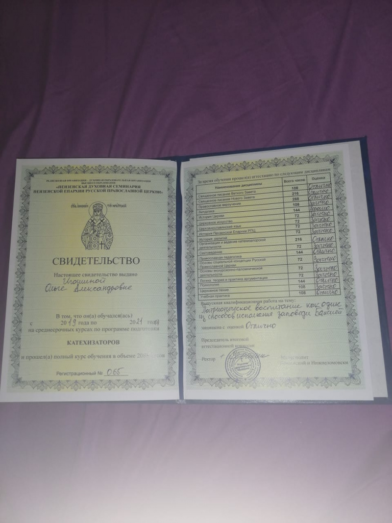 Завершился учебный год в Пензенской православной духовной семинарии. По результатам итоговой аттестации, руководитель воскресной школы при храме Преображения Господня р.п. Исса Игошина Ольга Александровна, получила специальность катехизатора, завершив обучение на среднесрочных курсах при семинарии. " Да благословит Господь праведные труды всякого уповающего на Него".