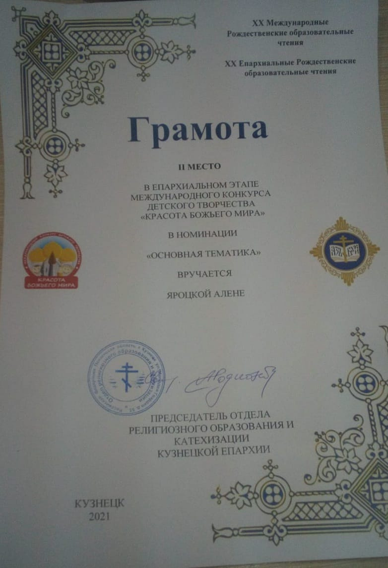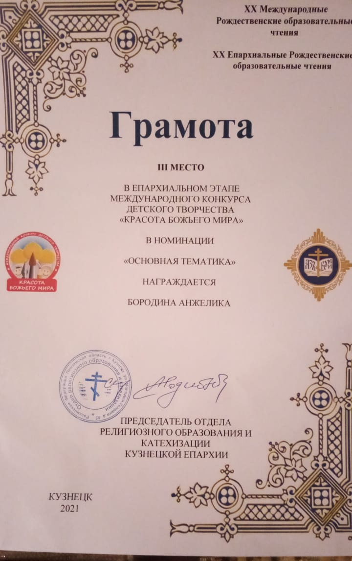 В понедельник,1 ноября, в духовно-просветительском центре Кузнецкой епархии прошла церемония награждения победителей и участников конкурса "Красота Божьего мира". Иссинское благочиние представляли обучающиеся МБОУ ДО ДШИ района, призеры конкурса в номинации "основная тематика": Яроцкая Алена ( II место, возрастная группа 9-12 лет), Бородина Анжелика ( III место, возрастная группа 13-17 лет), под руководством преподавателя Брагиной М.М. Девочки получили грамоты от руководителя епархиального отдела религиозного образования и катехизации иерея Алексея Родионова, а также памятные подарки. На торжественном мероприятии присутствовали: директор МБОУ ДО ДШИ Иссинского района Сатыренко Татьяна Борисовна, благочинный округа протоиерей Сергий Афонюшкин. Приехавшие гости города посетили Вознесенский кафедральный собор Кузнецка. Поздравляем наших призеров епархиального конкурса!